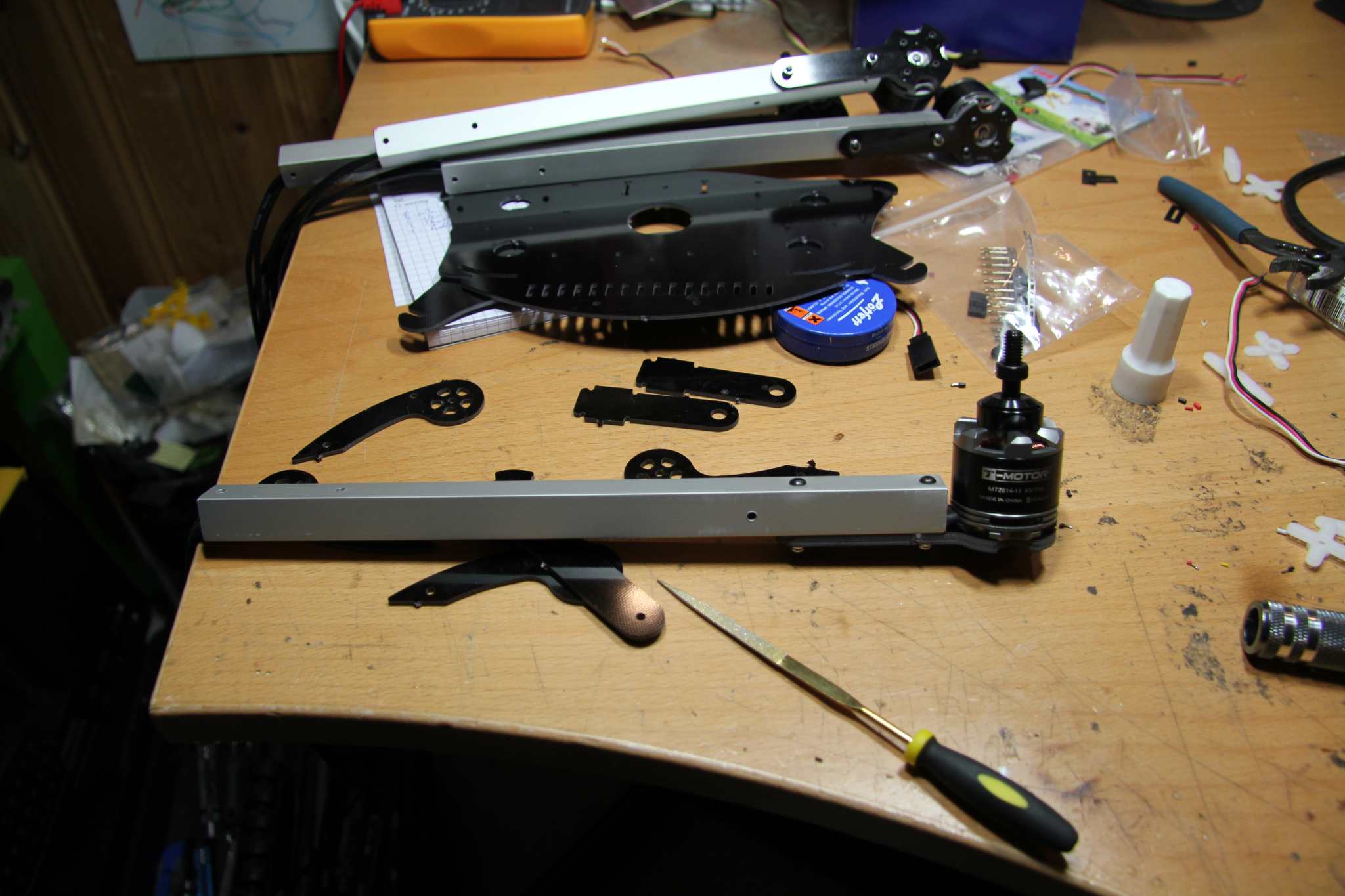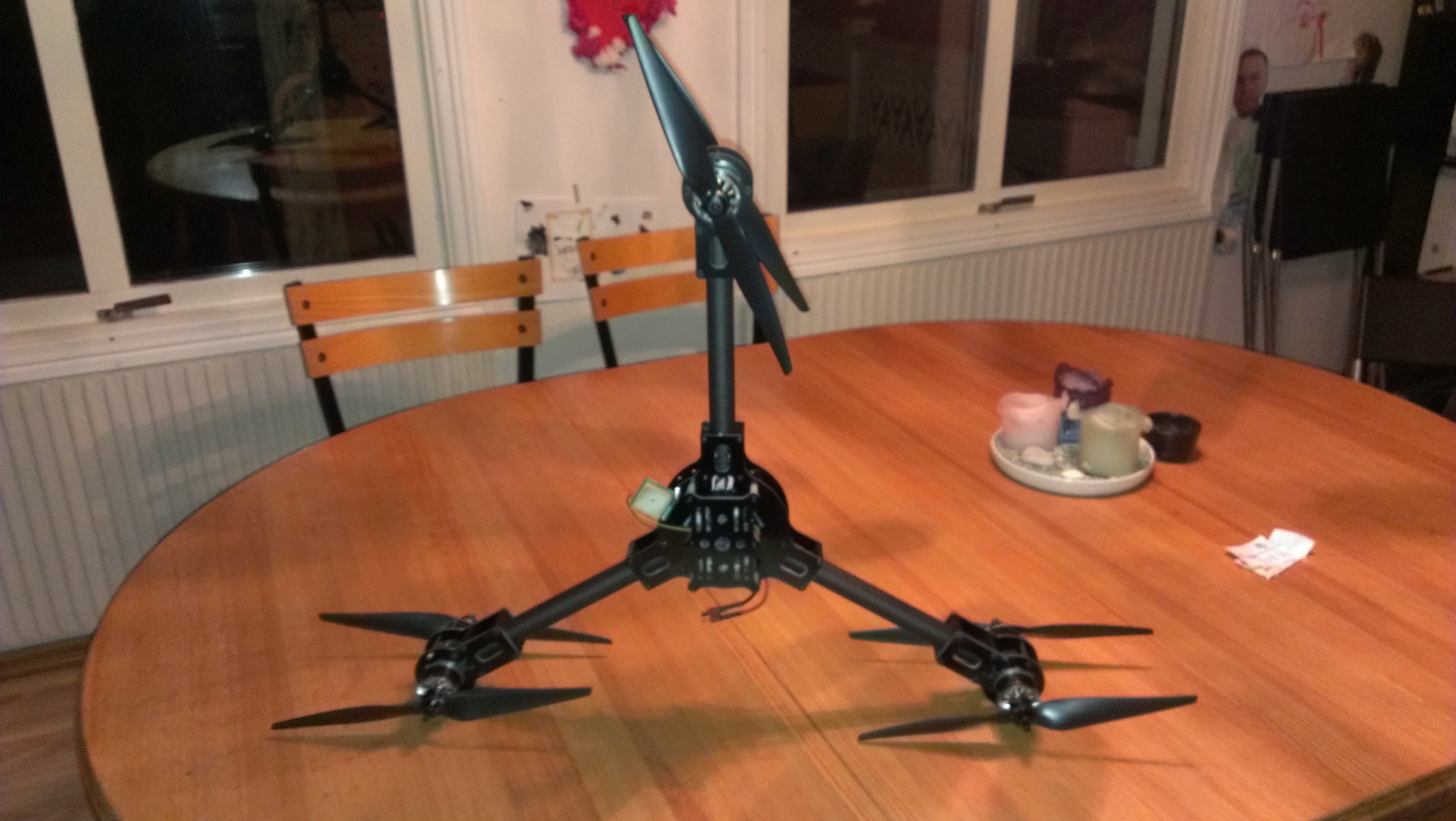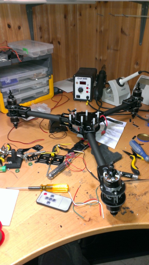 De snygga pin-liknande prylarna som ligger på bordet är benen till maskinen. Blev rätt nice till utseendet, och hela rasket känns riktigt stabilt och fint. Tror att denna kommer att flyga bra. Setupen blir T-motors motorer, Hobbyking ESC:ar flashade med SimonK mjukvara, DJI Naza med GPS som styrenhet som styrs via S.bus från min nya Futabaradio. Alltihop drivs som vanligt av ett par 3000mAh 4s accar… Typ samma setup som gamla bettan mao, men paketerat på annat sätt.